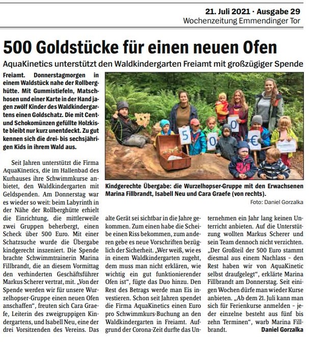 Schon seit Jahren spendet die Firma AquaKinetics einen Euro pro Schwimmkurs-Buchung an den Waldkindergarten in Freiamt. Aufgrund der Corona-Zeit durfte das Unternehmen ein Jahr lang keinen Unterricht anbieten. Auf die Unterstützung wollten Markus Scherer und sein Team dennoch nicht verzichten. „Der Großteil der 500 Euro stammt diesmal aus einem Nachlass – den Rest haben wir von AquaKinetics selbst draufgelegt“, erklärte Marina Fillbrandt am Donnerstag. Seit einigen Wochen dürfe man wieder Kurse anbieten. „Ab dem 21. Juli kann man sich für Ferienkurse anmelden – jeder einzelne besteht aus fünf bis zehn Terminen“, warb Marina Fillbrandt.