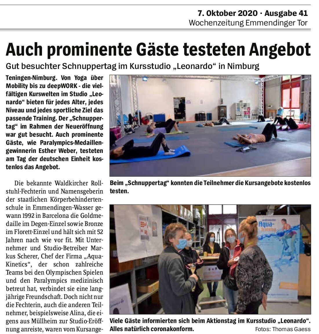 Die bekannte Waldkircher Rollstuhl-Fechterin und Namensgeberin der staatlichen Körperbehindertenschule in Emmendingen-Wasser gewann 1992 in Barcelona die Goldmedaille im Degen-Einzel sowie Bronze im Florett-Einzel und hält sich mit 52 Jahren nach wie vor fit. Mit Unternehmer und Studio-Betreiber Markus Scherer, Chef der Firma "AquaKinetics", der schon zahlreiche Teams bei den Olympischen Spielen und den Paralympics medizinisch betreut hat, verbindet sie eine langjährige Freundschaft. Doch nicht nur die Fechterin, auch die anderen Teilnehmer, beispielsweise Alina, die eigens aus Müllheim zur Studio-Eröffnung anreiste, waren vom Kursangebot begeistert. Als der Aktionstag um 11:00 Uhr begann, standen bereits die ersten Gäste vor der Tür, die sich für den "Schnuppertag" via Internet ordnungsgemäß angemeldet hatten. Schon kuz darauf begannen die Kurse im modernen "Leonardo"-Studio. Trainerin Jutta Luem und ihre Kollegen gewährten den überwiegend weiblichen Teilnehmern einen interessanten Einblick in die verschiedenen Kurswelten. Neben Yoga, Mobility und deepWork werden auf 150qm auch Pilates, Faszientraining, Rückenfit-Kurse oder neueste Fitnesstrends wie "Core&BeBo" angeboten. Der attraktiv gestaltete Trainingsraum ist mit einem speziellen, gelenkschonenden Fitnessboden und professionellem technischen Equipment (Light-Show und Bose-Soundanlage) ausgestattet.