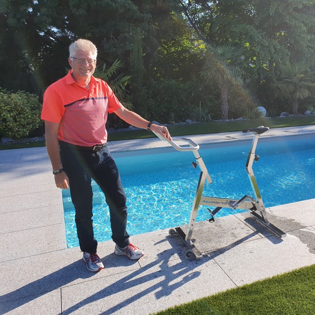 Seine Erwartungen an das Training mit dem Aquarider wurden voll erfüllt. „Ich habe auch Zuhause viel Spaß beim Aquabiking gehabt und dadurch noch mehr Sport getrieben als zuvor“, bilanziert Heinz K. aus BöhlIggelheim begeistert. Toll sei, dass man im eigenen Pool spontan und unabhängig zu jedem gewünschten Zeitpunkt trainieren könne. Dass er seine Trainingseinheiten individuell gestalten konnte, habe ihn sehr motiviert. Und so hat er sich in der dreiwöchigen Testphase insgesamt 14 Mal auf den Unterwasser-Ergometer geschwungen und jeweils zwischen 25 und 35 Minuten lang intensiv trainiert. „Das Aquacycling gibt mir ein gutes Gefühl, etwas für meinen Körper getan zu haben“, lautet sein Fazit. Auch vom neuesten Modell des Aquariders ist er sehr begeistert: „Das komplette Trainingsgerät ist sehr gut verarbeitet und für den Einsatz im privaten Bereich einfach perfekt“, urteilt der 57-Jährige.