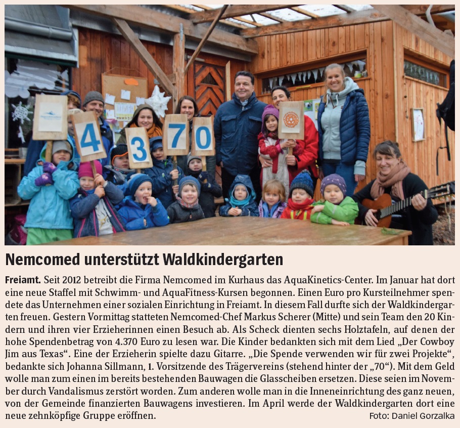 Freiamt. Seit 2012 betreibt die Firma nemcomed im Kurhaus das AquaKinetics-Center. Im Januar hat dort eine neue Staffel mit Schwimm-und AquaFitness Kursen begonnen. Einen Euro pro Kursteilnehmer spendete das Unternehmen einer sozialen Einrichtung in Freiamt. In diesem Fall durfte sich der Waldkindergarten freuen. Gestern Vormittag statteten Nemcomed-Chef Markus Scherer (Mitte) und sein Team den 20 Kindern und Ihren vier Erzieherinnen einen Besuch ab. Als Scheck dienten sechs Holztafeln, auf denen der hohe Spendenbetrag von 4.370 Euro zu lesen war. Die Kinder bedankten sich mit dem Lied "der Cowboy Jim aus Texas". Eine Erzieherin spielte dazu Gitarre. "Die Spende verwenden wir für zwei Projekte", bedankte sich Johanna Sillmann, 1. Vorsitzende des Trägervereins (stehend hinter der "70"). Mit dem Geld wolle man zum einen im bereits bestehenden Bauwagen die Glasscheiben ersetzen. Diese seien im November durch Vandalismus zerstört worden. Zum anderen wolle man in die Inneneinrichtung des ganz neuen, von der Gemeinde finanzierten Bauwagens investieren.