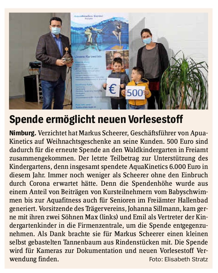 Nimburg. Verzichtet hat Markus Scherer, Geschäftsführer von Aqua-Kinetics auf Weihnachtsgeschenke an seine Kunden. € 500 sind dadurch für die erneute Spende an den Waldkindergarten in Freiamt zusammengekommen. Der letzte Teilbetrag zur Unterstützung des Kindergartens, denn insgesamt spendete AquaKinetics € 6.000 in diesem Jahr. Immer noch weniger als Scherer ohne den Einbruch durch Corona erwartet hätte. Denn die Spendenhöhe wurde aus einem Anteil von Beiträgen von Kursteilnehmern aus Babyschwimmen bis zur AquaFitness auch für Senioren im Freiämter Hallenbad generiert.