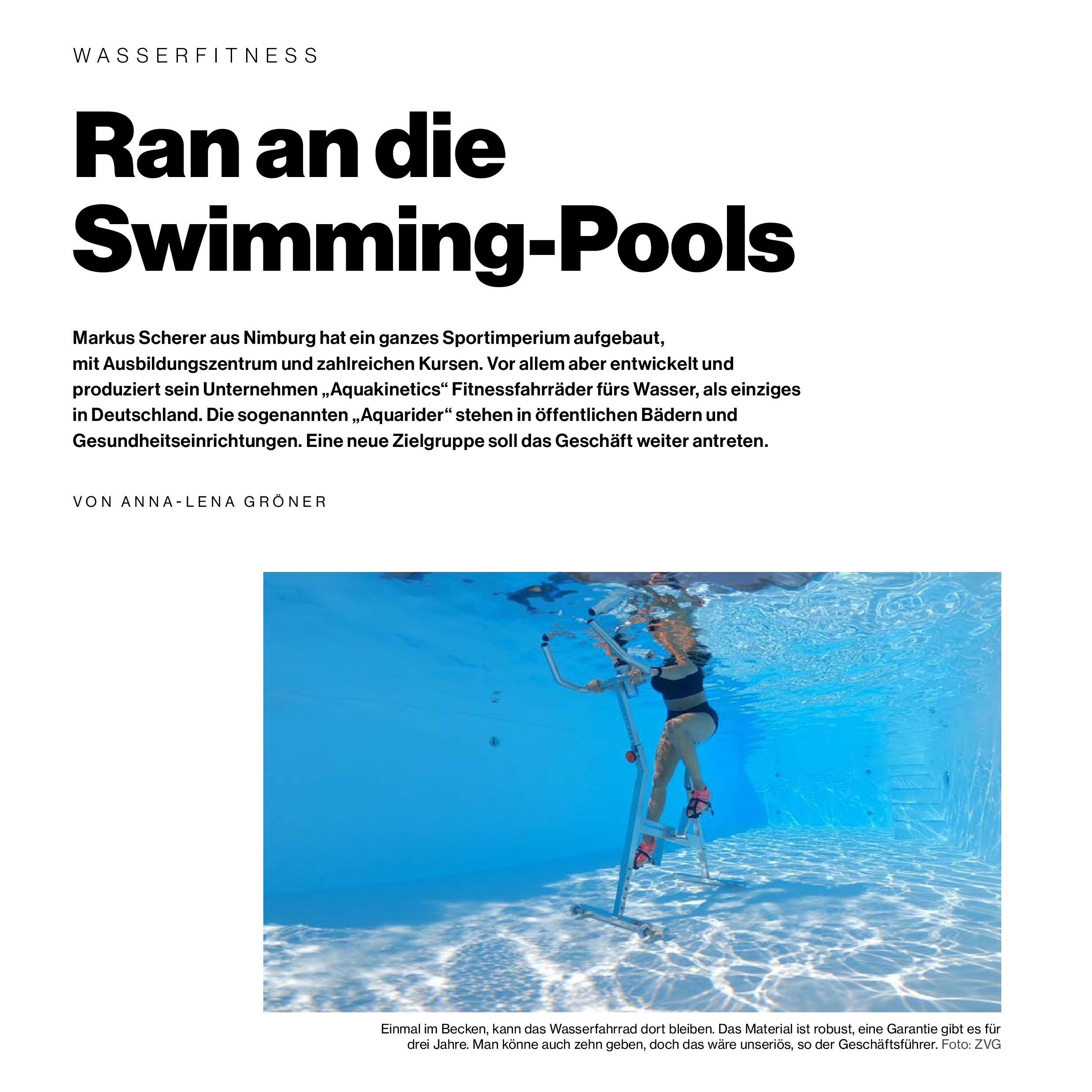 Markus Scherer aus Nimburg hat ein ganzes Sportimperium aufgebaut, mit Ausbildungszentrum und zahlreichen Kursen. Vor allem aber entwickelt und produziert sein Unternehmen „Aquakinetics“ Fitnessfahrräder fürs Wasser, als einziges in Deutschland. Die sogenannten „Aquarider“ stehen in öffentlichen Bädern und Gesundheitseinrichtungen. Eine neue Zielgruppe soll das Geschäft weiter antreten.