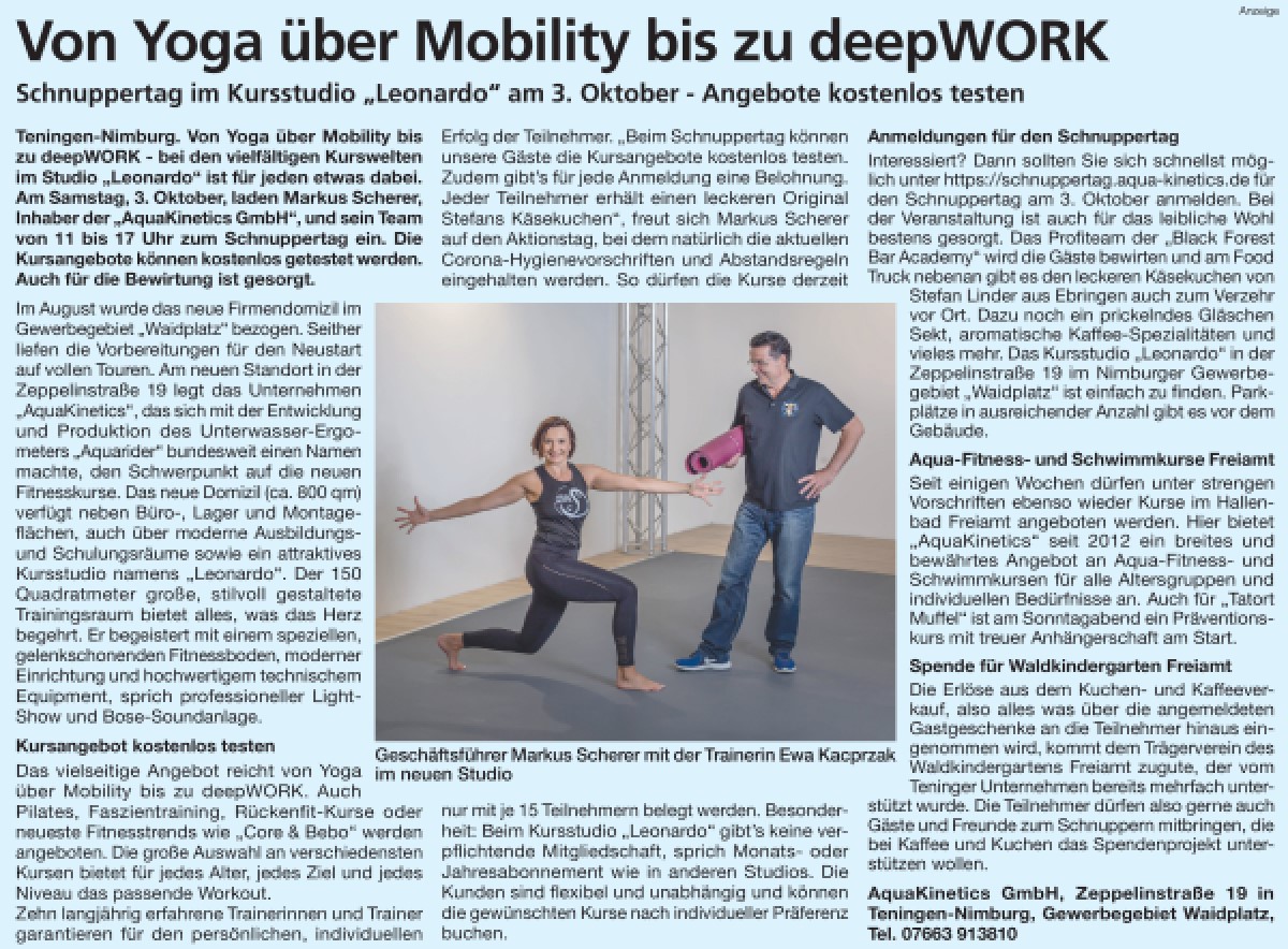 Teningen-Nimburg. Von Yoga über Mobility bis zu deepWORK - bei den vielfältigen Kurswelten im Studio „Leonardo“ ist für jeden etwas dabei. Am Samstag, 3. Oktober, laden Markus Scherer, Inhaber der „AquaKinetics GmbH“, und sein Team von 11 bis 17 Uhr zum Schnuppertag ein. Die Kursangebote können kostenlos getestet werden. Auch für die Bewirtung ist gesorgt.